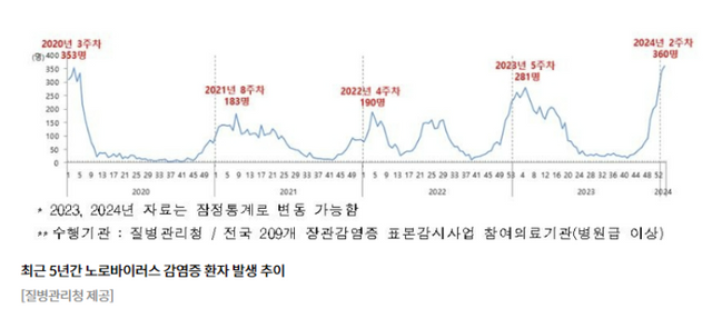 이번 겨울 노로바이러스 감염증은 최근 5년 사이 최고 수준으로 발생하고 있다. 올해 2주차(1월 7∼13일)에만 360명이 노로바이러스에 감염됐는데 이는 최근 5년 중 주간 단위로 가장 많은 감염자가 나온 2020년 3주차(353명)보다 많은 수치다. 노로바이러스가 통상 1월 3주∼2월 4주에 유행하는 특성을 고려하면 당분간은 유행이 이어질 것으로 보인다.