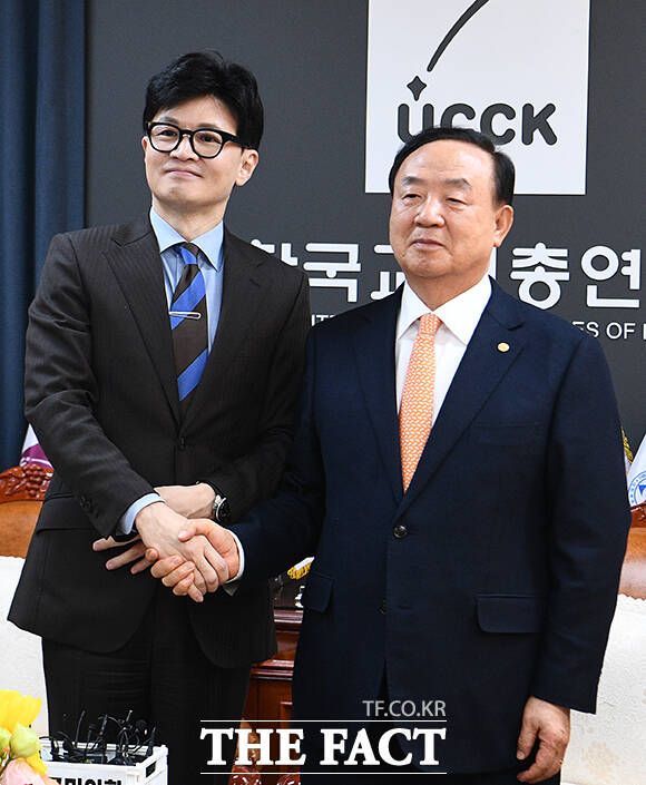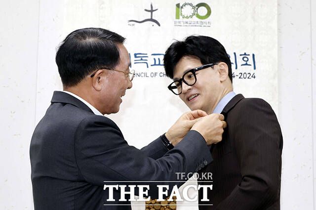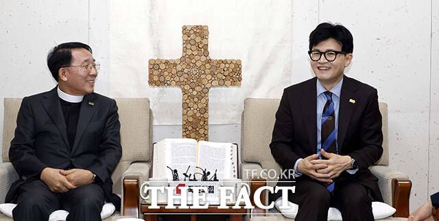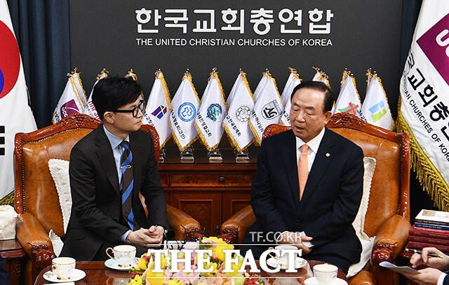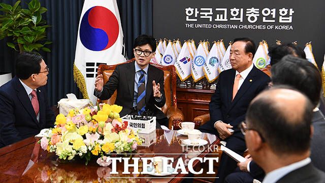 [더팩트ㅣ이동률 기자] 한동훈 국민의힘 비상대책위원장이 19일 오전 종로구 한국기독교회관에서 장종현 한국교회총연합 대표회장과 김종생 한국기독교교회협의회 총무를 예방하고 있다.