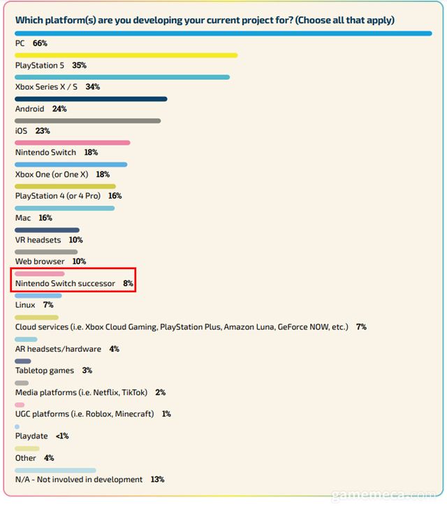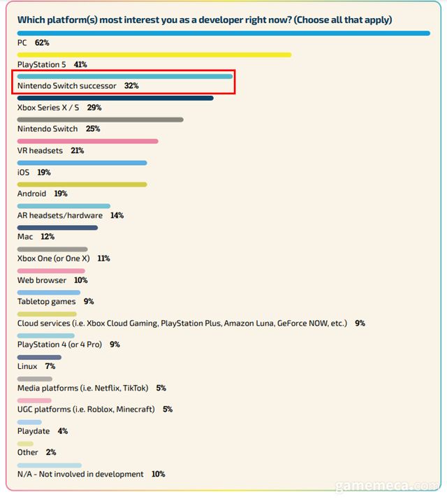 이번 조사 결과에는 게임업계 현황 및 주요 이슈에 대한 질문과 이에 대한 응답이 담겨 있다. 이 중 ‘현재 맡고 있는 프로젝트를 어떠한 플랫폼으로 개발 중인지 모두 체크해달라’라는 질문에 대해 닌텐도 스위치 후속 기기(Nintendo Switch successor)라고 응답한 사람이 8%로 나타났다. 닌텐도가 스위치 후속 기기를 공식적으로 발표한 적은 없으나, 이를 토대로 신작을 제작 중이라는 응답은 기기 출시가 다가오고 있음을 보여주는 신호이기도 하다. 아울러 ‘현재 가장 관심이 높은 플랫폼을 모두 체크헤달라’라는 질문에 32%가 닌텐도 스위치 후속 기기라 답변하기도 했다.