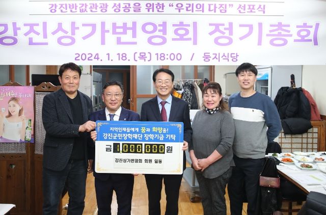이날 강진상가번번영회 회원들은 뜻을 모아 강진군민장학금 100만원을 기탁했다.