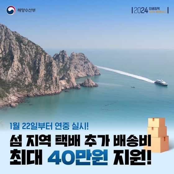 해양수산부는 섬 지역 주민들의 부담을 덜고 민생안정을 위해 섬 지역 택배 추가 배송비를 1인당 연간 최대 40만 원 지원하기로 했다.