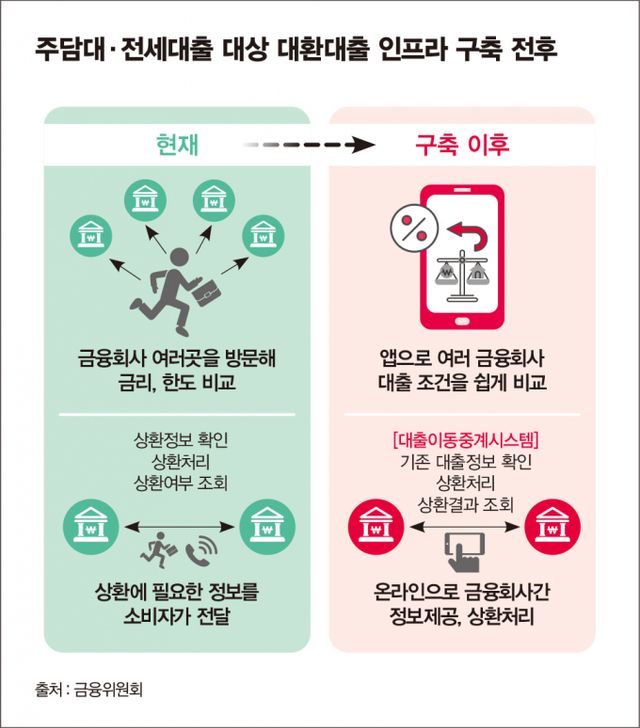 다만 주담대 대환대출 대상은 KB, 한국부동산원 등 시세 조회가 가능한 10억원 이하의 아파트 담보대출을 대상으로 대출 실행 이후 6개월이 지나야 한다. 정책금융상품이나 특정 협약 금융기관 취급상품 등은 제외되며 연체되거나 법률상 분쟁이 빚어진 대출은 대환이 불가능하다.