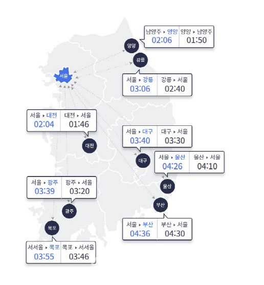 버스로 서울에서 지방 대도시(요금소 출발 기준)간 소요시간은 이날 오전 10시 기준 △부산 4시간30분 △울산 4시간22분 △대구 3시간36분 △광주 3시간20분 △강릉 3시간10분이다. 같은 시간 지방도시에서 서울까지는 △부산 4시간30분 △울산 4시간10분 △대구 3시간30분 △광주 3시간20분 △대전 1시간30분 △강릉 2시간40분이다.