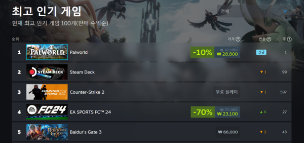 이용자들의 호평 역시 이어지고 있다. 현재 스팀 ‘팔월드’ 페이지에는 약 7,000여 개 이상 이용자 평가가 누적된 가운데, 이 중 92%가 게임을 긍정적으로 평가한 ‘매우 긍정적’을 획득하고 있다. 게임의 출시 극초반, 얼리억세스 버전임을 고려할 경우, 향후 95% 비율을 넘어 최고 평가인 ‘압도적으로 긍정적’을 획득할 가능성 역시 높아 보이는 상태다. 이외에도 매출 부문에서도 스팀 전체 1위 자리를 차지하고 있다.