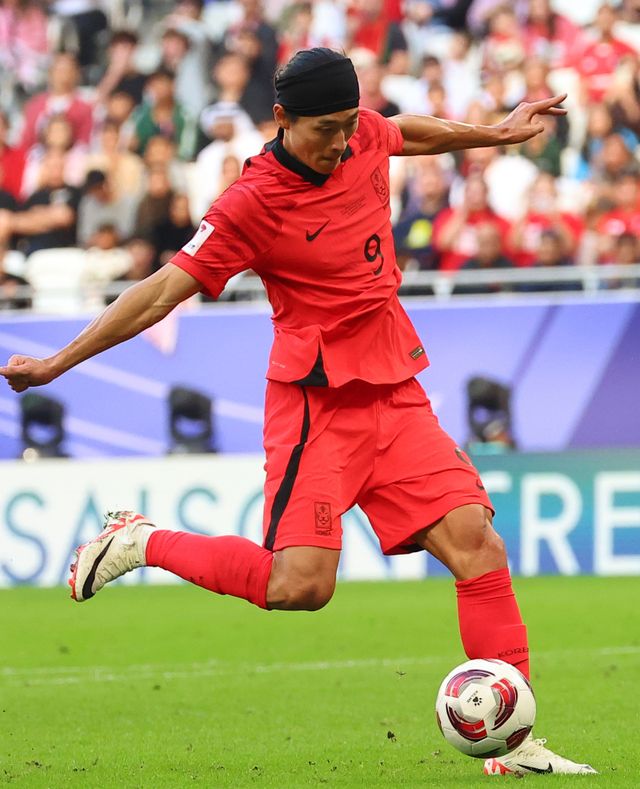 20일(현지시간) 카타르 도하 앗수마마 스타디움에서 열린 2023 아시아축구연맹(AFC) 카타르 아시안컵 조별리그 E조 2차전 요르단과 한국의 경기. 조규성이 슛을 시도하고 있다. 연합뉴스