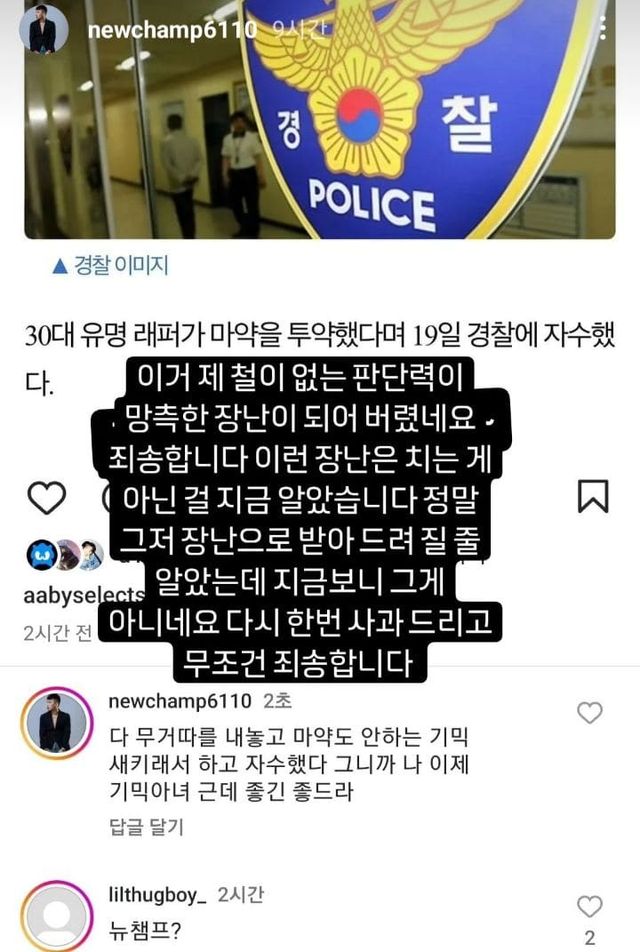 이어 "본인은 마약을 하지 않고 있다"며 "죄송한 이유는 마약을 하고 자수한 유명 랩퍼의 신상이 누군지 주목되는 가운데 한 커뮤니티에서 퍼 온 기사에 댓글로 '제가 마약을 하고 자수한 그 장본인이라고 장난을 친 것'이 기사화가 되고 여러 블로그와 커뮤니티에 퍼지고 있는데에 대한 것"이라고 설명했습니다.