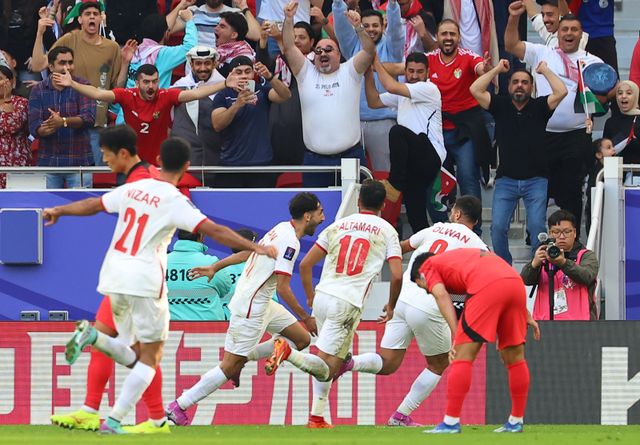 20일(현지시간) 카타르 도하 앗수마마 스타디움에서 열린 2023 아시아축구연맹(AFC) 카타르 아시안컵 조별리그 E조 2차전 요르단과 한국의 경기. 한국이 요르단 야잔 알나이마트에게 역전골을 허용하고 있다. 연합뉴스