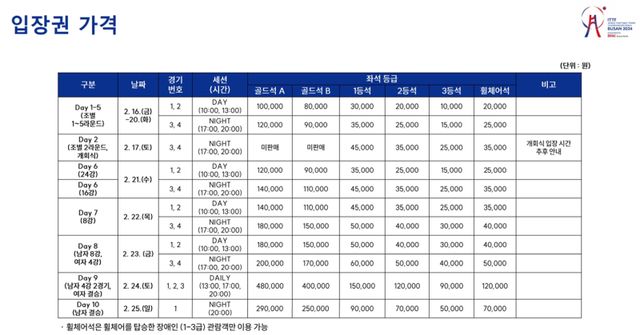메인 경기장의 가장 등급이 낮은 3등석 기준으로 대회 첫날 데이 세션 티켓은 1만원이며 9일 차 티켓은 9만원, 10일 차 티켓은 5만원이다.