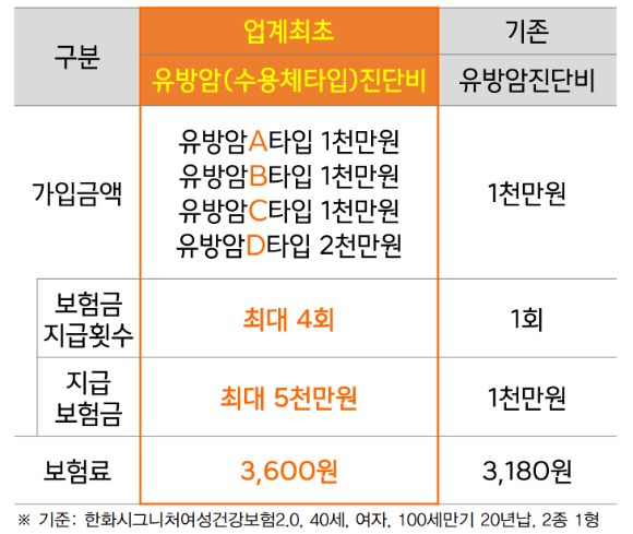 신 담보는 기존 유방암 진단비 담보와 비교해 보험료 차이가 거의 없다. 40세 여성, 20년납, 100세 만기 한화시그니처여성건강보험 기준 보험료는 유방암 수용체 타입 진단비가 3600원, 유방암 진단비가 3180원이다. 가입 금액은 각각 최대 5000만원, 1000만원이다.
