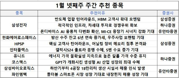 삼성증권은 삼성전자에 대해 "반도체 업황의 턴어라운드, 고대역폭메모리(HBM) 고객사 확대 모멘텀이 있다"고 설명했으며 한화에어로스페이스에 대해선 "방산 수주 잔고가 6년 연속 증가세이며 우주사업 모멘텀도 기대된다"고 말했다.