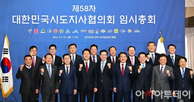 박형준 대한민국시도지사협의회장(부산시장)이 22일 오전 서울 중구 한국프레스센터에서 열린 제58차 대한민국시도지사협의회 임시총회에서 오세훈 서울시장과 김관영 부회장(전북특별자치도지사) 등 시도지사들과 기념촬영을 하고 있다. /정재훈 기자