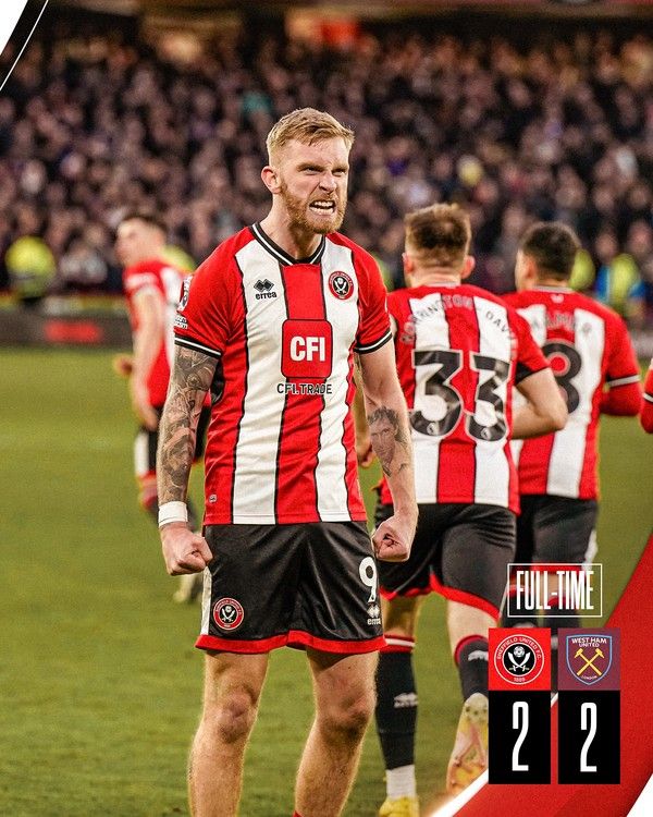 셰필드가 일진일퇴 공방전 끝에 비겼다. 전반 28분 대니 잉스의 슈팅이 수비를 맞고 튀어나간 걸 막스웰 코르네가 재차 집어넣어 웨스트햄이 앞서나가자 셰필드는 전반 44분 윌리엄 오술라의 헤더를 알퐁소 아레올라가 쳐낸 걸 벤 브레레톤 디아스가 재차 발로 집어넣으며 균형을 맞췄다.