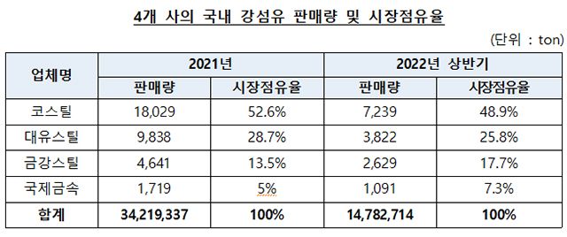 국내 강섬유 시장점유율은 2021년 판매량 기준 코스틸 52.6%, 대유스틸 28.7%, 금강스틸 13.5%, 국제금속 5%로, 이 사건 4개 사업자가 100%의 점유율을 차지하고 있다.