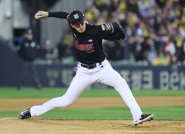 고영표가 지난해 11월 7일 오후 서울 송파구 잠실야구장에서 열린 프로야구 '2023 신한은행 SOL KBO 포스트시즌' 한국시리즈 1차전 kt 위즈와 LG 트윈스의 경기에서 역투하고 있다. / 뉴스1