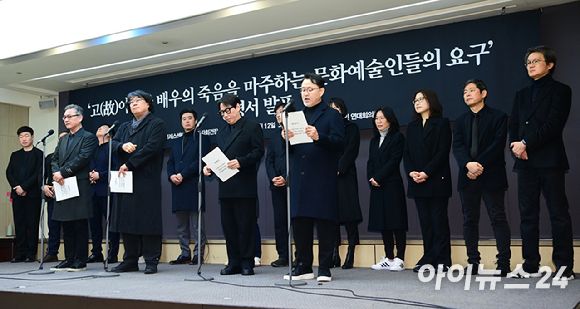 문화예술인 연대회의(가칭)가 지난 12일 오전 서울 광화문 한국프레스센터에서 '고(故) 이선균 배우의 죽음을 마주하는 문화예술인들의 요구' 성명서를 발표하는 자리를 가졌다. 배우 김의성, 봉준호 감독, 가수 윤종신, 이원태 감독이 성명서를 발표하고 있다. [사진=정소희 기자]