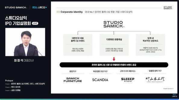 최정석 스튜디오삼익 대표는 23일 온라인 기업 설명회에서 “성공적인 브랜딩 리뉴얼 전략을 보유한 데다 제품기획부터 출시까지 한 달이 소요되는 트렌디한 제품기획 역량을 보유하고 있다”며 “유통채널 다각화와 최적화된 밸류체인 구축, 업계 최초 홈퍼니싱 풀필먼트(상품보관·배송·설치·시공까지 등 물류 전 과정 대행) 서비스 제공을 통해 홈퍼니싱 시장 내 독보적 지위를 갖추겠다”고 말했다.