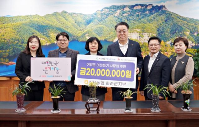 [파이낸셜경제=김영란 기자] 화순군은 이웃에게 희망과 사랑을 전하는 나눔문화 분위기 확산을 위해 2023년 12월 1일부터 2024년 1월 31일까지 2개월간 ‘희망 2024 나눔 캠페인’을 전개하는 가운데 NH농협 화순군지부에서 어려운 이웃을 위해 현금 2,000만 원을 기부했다고 밝혔다.