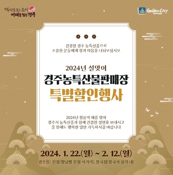 [파이낸셜경제=김예빈 기자] 경주시가 갑진년 설을 맞아 서민들의 장바구니 부담을 낮추기 위해 다음달 12일까지 풍성하고 알찬 농축수산물 특별 할인 이벤트를 선보인다.