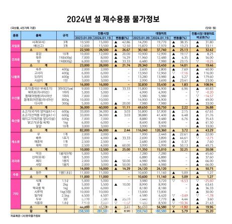 한편 매년 차례상 물가가 역대 최고치를 기록하면서 정부도 매년 설 민생 안정을 위한 대책을 내놓고 있다. 올해는 16대 성수품을 25만7000t 공급하고, 수입과일류 등에 할당관세 물량을 도입한다. 농·축·수산물 할인도 전년 대비 2배 이상 확대된 역대 최대 규모(840억원)로 지원한다.
