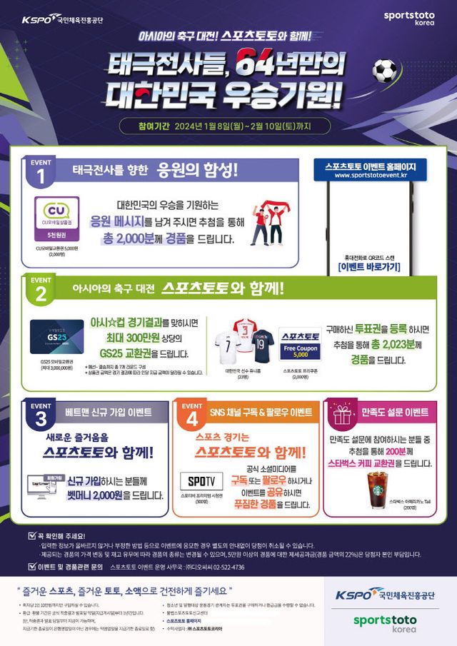 이어, 아시안컵 최종 우승팀을 맞히는 게임인 프로토 기록식 3회차 X유형 게임 구매자 대상 이벤트는 구매 후 이벤트 페이지에 실물 투표권 번호를 등록하면 추첨을 통해 대한민국 국가대표 유니폼 및 스포츠토토 프리쿠폰(5000원 상당)을 2023명에게 증정한다.