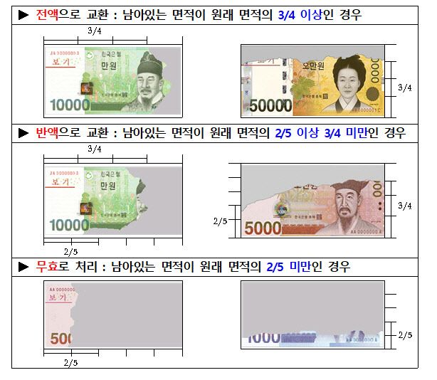 화재 등으로 은행권이 손상돼 사용할 수 없게 된 경우, 남아 있는 면적이 3/4 이상이면 액면금액의 전액을, 2/5 이상~3/4 미만이면 반액으로 교환할 수 있다. 손상된 주화는 액면금액으로 교환 가능하지만, 모양을 알아보기 어렵거나 진위를 판별하기 어려운 주화는 교환할 수 없다.