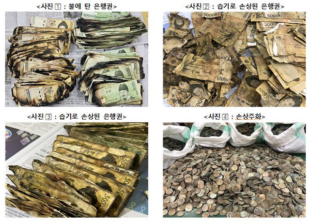 화폐가 손상된 것은 습기가 많은 곳 등 부적절하게 보관하거나 화재로 탄 경우가 많았다. 실제로 자택 화재로 훼손된 은행권 1910만원을 교환하기도 했고, 땅속에 묻어 습기로 부패한 은행권 1547만5000원을 교환하는 사례와 습한 장소에 장기간 보관해 부패한 은행권 1972만5000원을 교환한 경우도 있었다. 연못에서 수거한 손상주화 339만1000원을 교환한 사례도 있었다.