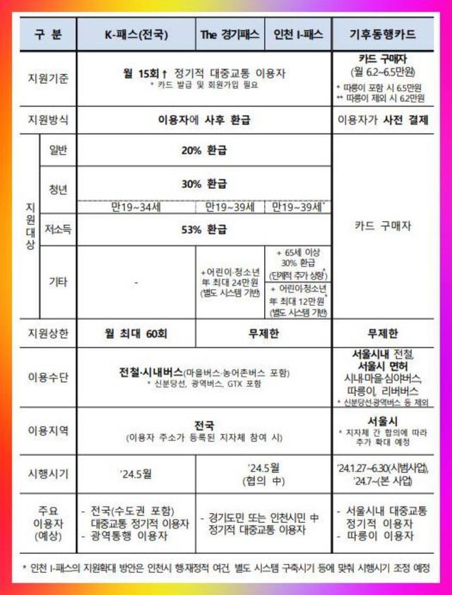 K-패스는 월 15회 이상 정기적으로 시내버스와 전철과 같은 대중교통을 이용할 경우, 지출 금액의 일정비율(일반인 20%, 청년층 30%, 저소득층 53%)을 다음 달에 돌려받는 교통카드(월 최대 60회)다. 오는 5월부터 출시될 예정인 K-패스는 대중교통을 자주 이용하는 청년·서민층 등 부담을 대폭 완화시켜 줄 목적으로 계획됐다. 수도권 3개 지자체를 포함한 전국 17개 시·도(189개 시·군·구)에서 K-패스를 사용하게 될 전망이다.