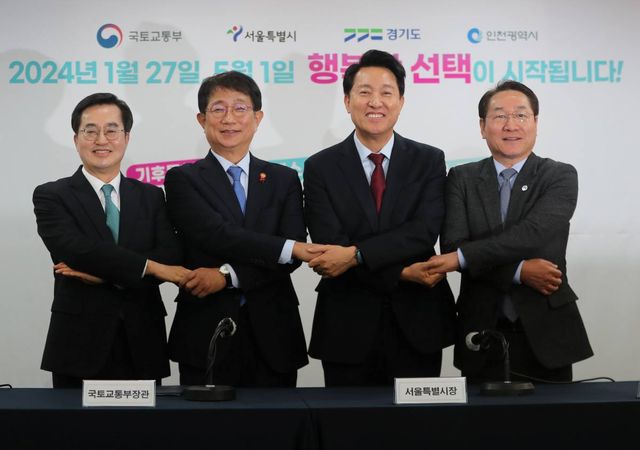 지난 22일 서울 중구 한국프레스센터에서 열린 기후동행카드·K-패스 대중교통 요금지원 국토교통부·수도권 지자체 합동 기자설명회에서 참석자들이 기념촬영을 하고 있다. 왼쪽부터 김동연 경기도지사, 박상우 국토교통부 장관, 오세훈 서울시장, 유정복 인천시장. / 공동취재-뉴스1