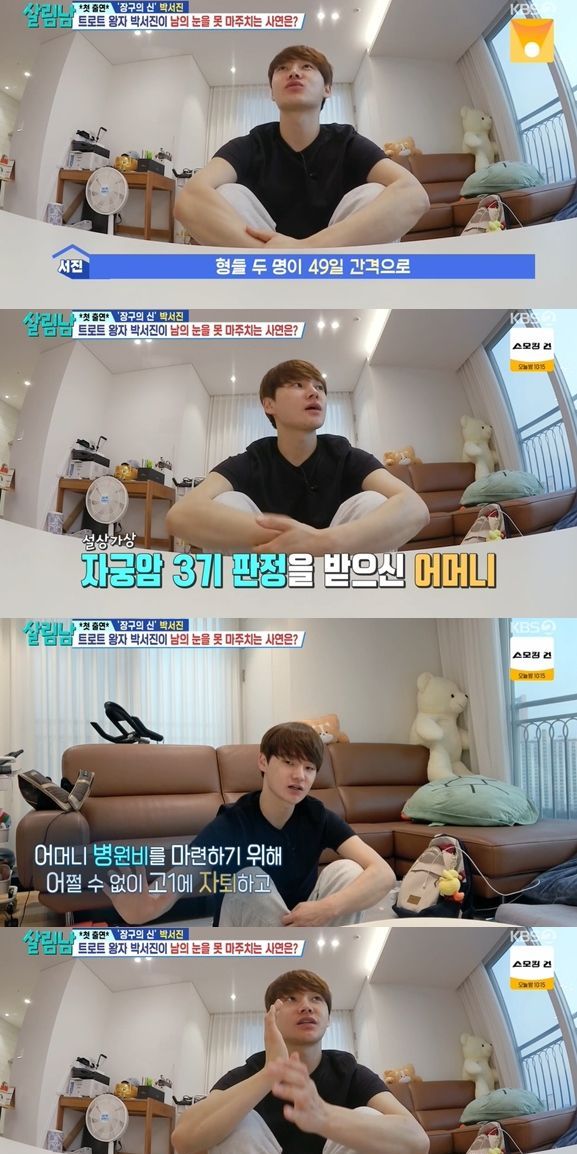 박서진은 "엄마가 암 판정을 받고, 형들이 없어지니까, 아빠랑 배를 타야 되니까 고등학교를 자퇴했다. 그러다 보니까 자연적으로 사회생활이 끊기게 되고, 관계 형성이 없어지니까 더 어두워질 수밖에 없었지 않나 싶다"고 얘기했다.