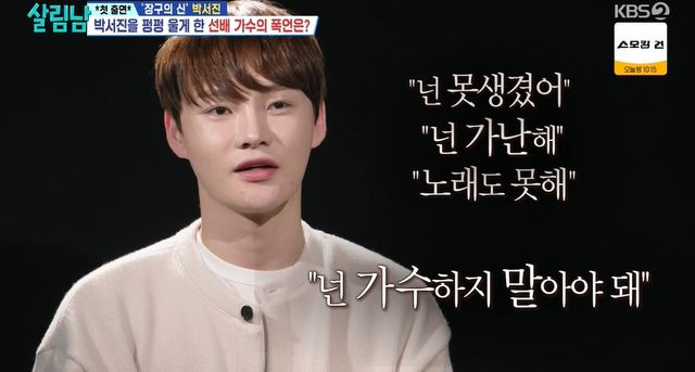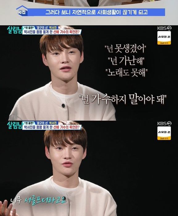 대뜸 하는 말은 '너처럼 못생기고, 집안에 돈이 없고, 노래 못하면 가수 하지 말아야 된다'로, 박서진은 "그런 말씀 하시는데 너무 서글프더라"고 솔직히 말했다.