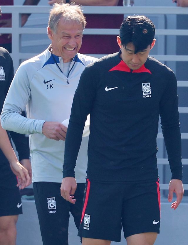 축구대표팀 클린스만 감독과 손흥민이 지난 23일(현지 시각) 카타르 도하 알에글라 훈련장에 들어서고 있다. / 연합뉴스