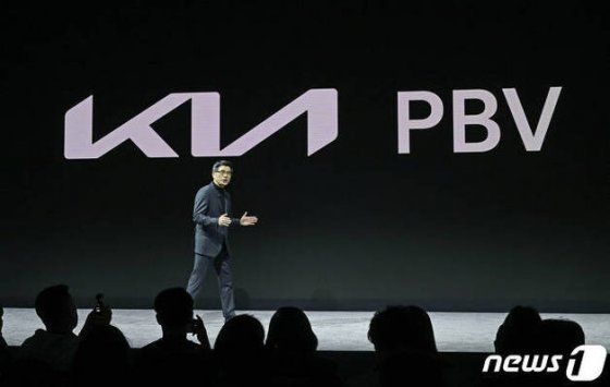 기아 송호성 사장이 CES 2024 미디어 컨퍼런스에서 기아 PBV 비전과 전략에 대해 발표하고 있는 모습.(기아 제공)