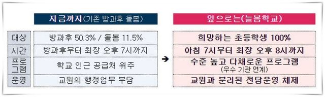 기존 방과후·돌봄교실과 앞으로 시행될 늘봄학교를 비교한 표. / 교육부 제공