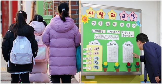 (왼쪽)25일 오전 서울 시내의 한 초등학교에 돌봄이 필요한 맞벌이 가정 등의 아이들이 등교하고 있다. (오른쪽)윤석열 대통령이 지난해 7월 3일 오후 방과 후 교육 활동·돌봄을 제공하는 늘봄학교 시범학교인 경기 수원초등학교를 찾아 교실에 붙어있는 식단표를 살펴보고 있다. / 뉴스1, 대통령실 제공-뉴스1
