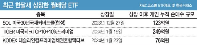 25일 코스콤 ETF체크에 따르면 최근 한달새 국내 시장에 상장된 월배당 ETF는 신한자산운용의 ‘SOL 미국30년국채커버드콜(합성)’, 미래에셋자산운용의 ‘TIGER 미국테크TOP10+10%프리미엄’, 삼성자산운용의 ‘KODEX 테슬라인컴프리미엄채권혼합액티브’ 등 모두 3종이다.