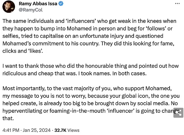 그는 "살라를 직접 만나면 '팔로우'나 '셀카'를 구걸할 사람들이 불행한 부상을 기회로 삼아 이집트에 대한 살라의 헌신에 의문을 제기했다"라며 "그들은 명성, 조회수, 좋아요를 얻기 위해 이런 일을 벌이고 있다. 난 그런 일들이 얼마나 값싼 일인지 지적해 준 명예로운 일을 한 사람들에게 감사를 전하고 싶다"라고 밝혔다.
