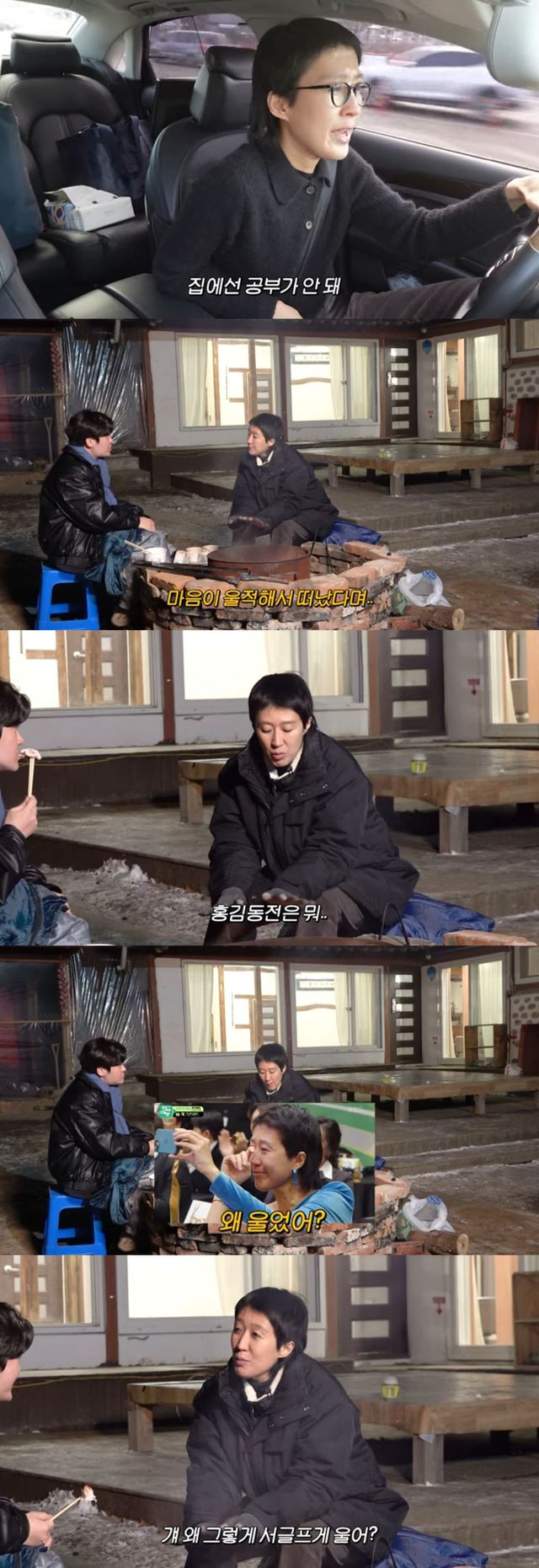 한편, 밤이 되고 홍진경은 PD와 함께 마당에서 모닥불에 닭가슴살을 구워 먹으며 시간을 보냈다. 이때 PD는 홍진경에게 "무슨 일이야? 마음이 울적해서 떠났다며"라고 폐지된 '홍김동전'을 언급했다. 이에 홍진경은 "홍김동전은 뭐, 끝날 거 끝난 건데"라고 말을 이었다.