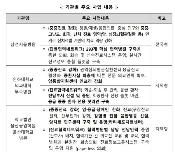 중증진료체계 강화 시범사업은 상급종합병원이 중증, 고난도진료에 집중하고 중증도가 낮은 환자를 지역으로 회송하는 동시에 회송된 환자가 가까운 곳에서 안심하고 진료받을 수 있도록 지역의료기관들과 진료협력체계를 구축하는 사업이다. 본래 시범사업은 2023년 1월 시행될 예정이었지만 참여기관 모집부터 난관에 봉착해 1년 연기됐다. 시범사업에 참여하는 병원은 ▲삼성서울병원 ▲울산대병원 ▲인하대병원 등 총 3곳이다.