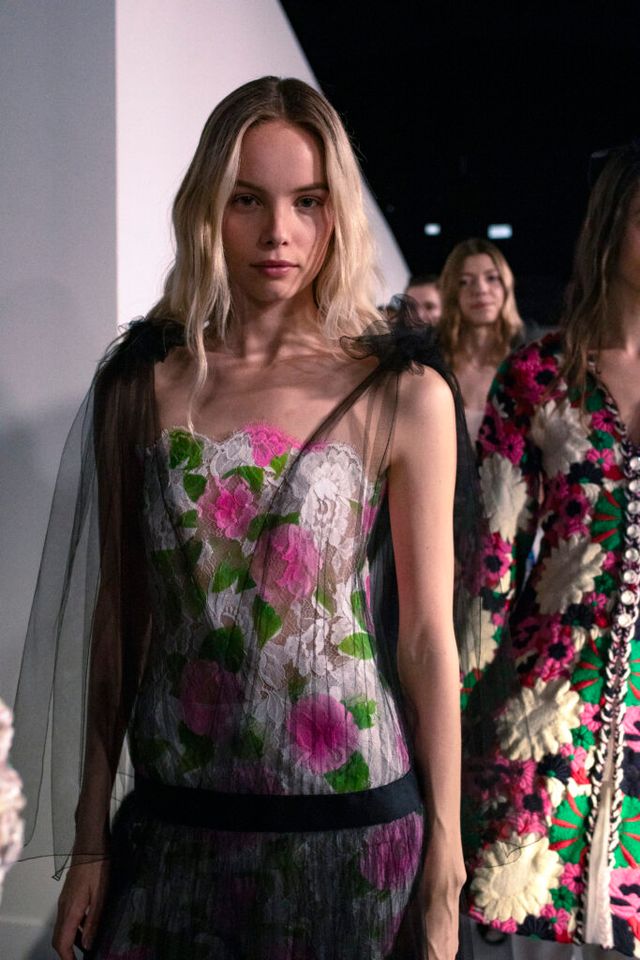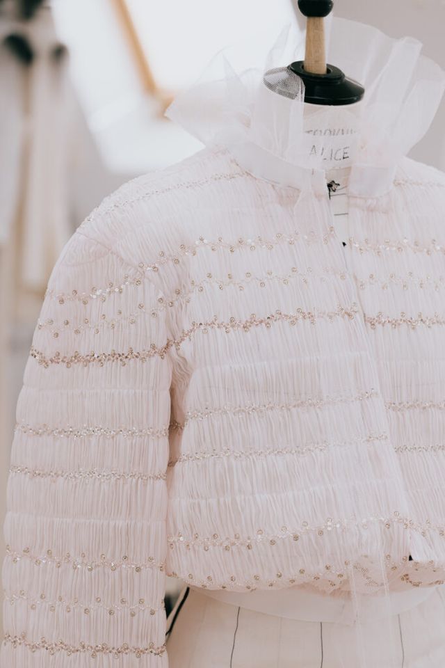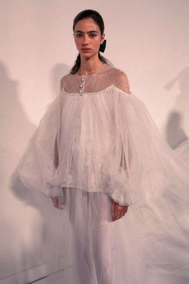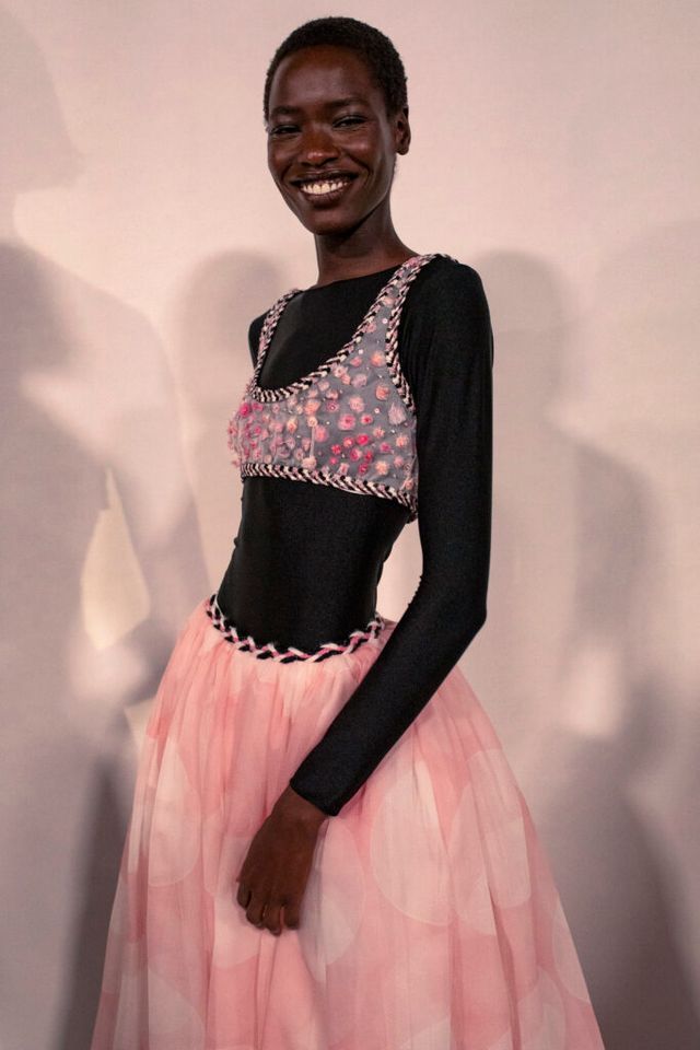 핑크와 화이트가 주된 컬러 팔레트 속에 20세기 초 러시아의 무대 미술가로 활동했던 레온 박스트(Léon Bakst)와 세르게이 디아길레프(Sergei Diaghilev)가 몸담았던 발레단 발레 뤼스(Ballets Russes)의 선명한 색채감에서 영감을 얻어 다채로운 피스를 선보였습니다. 또한 무용수들의 가볍고 부드러운 움직임을 드레이퍼리, 리본, 튤 포켓, 레이스 벨트, 플라워 장식 등의 디테일을 담아낸 투명한 스트레이트 스커트, 롱 드레스, 점프수트, 트위드 재킷, 짧은 케이프로 풀어냈습니다.