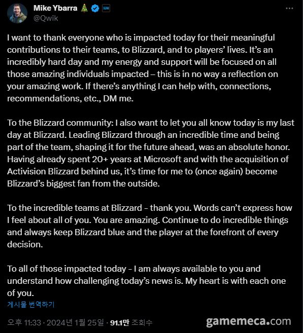 ▲ 블리자드 마이크 이바라 대표가 퇴사 사실을 밝혔다 (자료출처: 마이크 이바라 대표 X)