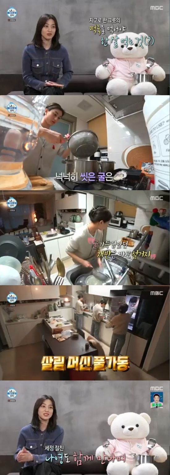 살림머신 모드가 발동한 지효는 고명용 지단부터 만들었다. 지효는 지단을 꽃 모양으로 만들다가 생각처럼 잘 되지 않아 난감해 했다. 지효는 지단에 이어 생김을 구워 김가루를 만들고 고명용 대파도 준비해둔 뒤 불려둔 떡을 굴이 끓고 있는 냄비에 투하했다.