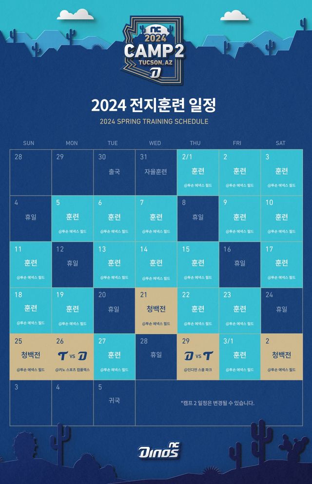 이번 캠프에는 강인권 감독 및 11명의 코칭스태프와 45명의 선수가 참가하며 1월 30일부터 3월 5일까지 36일간 진행된다.