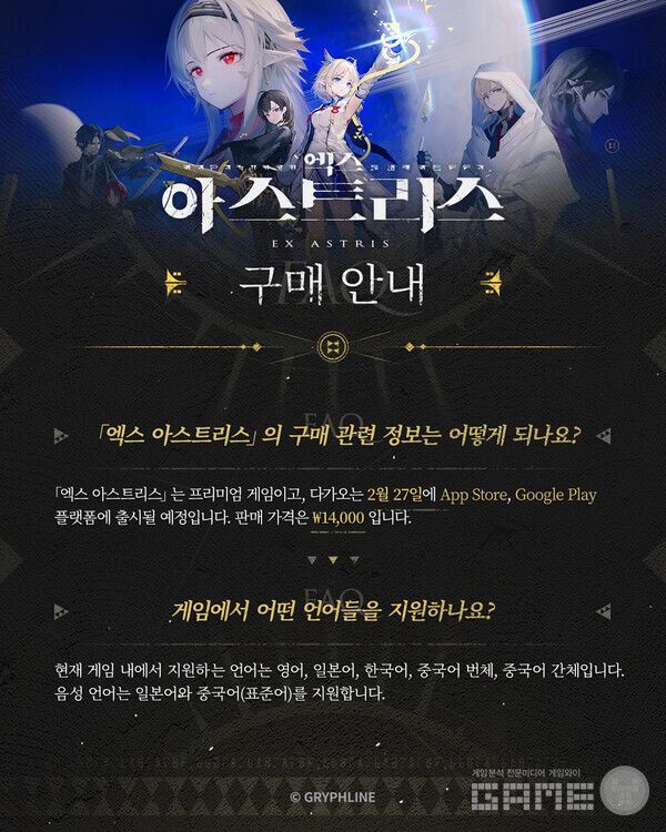 ‘엑스 아스트리스’는 하이퍼그리스 산하 개발사인 나우스 웨이브 스튜디오가 개발하고 있는 3D RPG 장르의 모바일 게임으로, 과금요소가 적고 게임을 구매해서 플레이하는 B2P(Buy to Play) 방식을 채택해 14,000원의 가격으로 출시될 예정이다.
