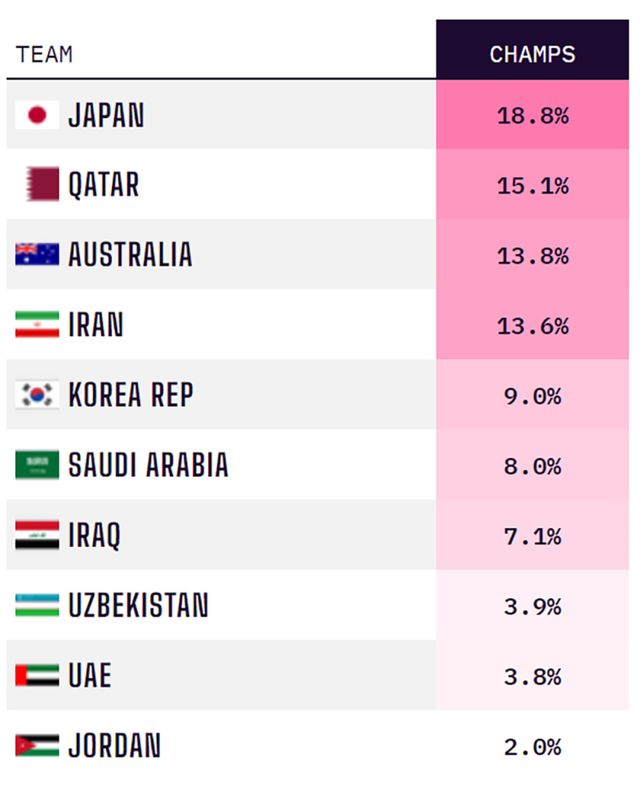 한국이 8강에 오를 경우 격돌할 가능성이 큰 호주는 13.8%로 3위, 이란은 13.6%로 4위에 각각 올랐다. 그 뒤를 이은 한국의 우승 확률은 6위 사우디아라비아(8%), 7위 이라크(7.1%)와도 큰 차이가 나지 않았다.