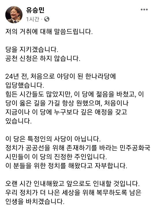 28일 유 전 의원은 자신의 SNS를 통해 "당을 지키겠다, 공천 신청은 하지 않겠다"고 밝혔다. 유 전 의원은 "저의 거취에 대해 말씀 드린다"는 글을 올리며 이같이 말했다.
