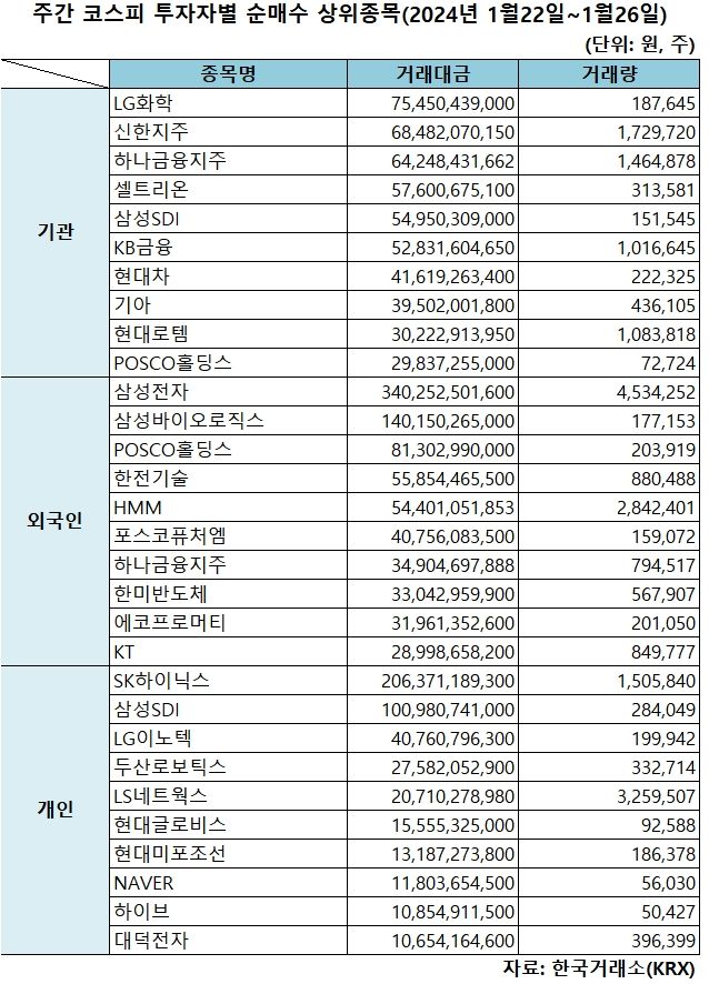 기관 'LG화학'·외인 '삼성전자'·개인 'SK하이닉스' 1위 [주간 코스피 순매수- 1월22일~1월26일]