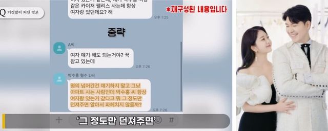 단체방에 있던 형수 지인 A씨는 "여자 이야기 하셔도 되는 거냐"라고 제차 물었고, 형수는 "(박수홍 아파트) 명의가 (김다예한테) 넘어간 건 얘기하지 말고 '박수홍 씨 같이 살고 있는 여자 있는 거 같은데', '항상 여자랑 있는 거 같다'라고만 던져주면 알아서 파헤치지 않을까"라고 답을 한 내용까지 공개되었습니다.