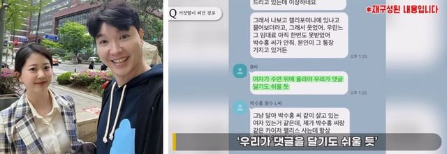 또한, 형수 이 씨는 "그냥 달아. 박수홍 같이 살고 있는 여자 있는 것 같은데, 제가 박수홍과 같은 아파트 사는데 항상 여자랑 있다고 해"라고 말했습니다. 여기서 여자는 당시 박수홍의 여자친구이자 현재 배우자인 김다예를 말합니다.