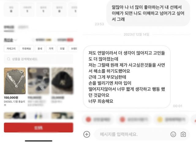 B씨는 "알잖아. 나 너 많이 좋아하는거. 내 선에서 이해가되면 나도 이해하고 넘어가고 싶어서 그래"라며 중고 장터에 선물을 내 놓게 된 이유를 물었고 이에 A씨는 "저도 연말이라 생각이 많아지고 고민도 많아졌는데 저는 그럴때면 제가 사고 싶은 것들을 사면서 해소를 하기도 했어요. 근데 그게 부모님한테 손을 벌리기엔 차마 입이 떨어지지 않아 너무 짧게 생각하고 행동했던 것 같아요. 너무 죄송해요"라는 답을 했다.