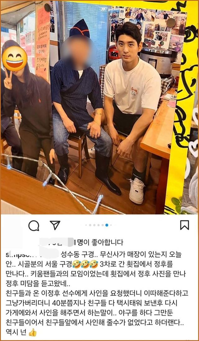 원 게시물 작성자는 서울의 한 횟집에 걸린 이정후 기념사진에 어떤 일화가 담겨 있는지 소개한다. 횟집 사장으로부터 직접 들은 일화라면서.